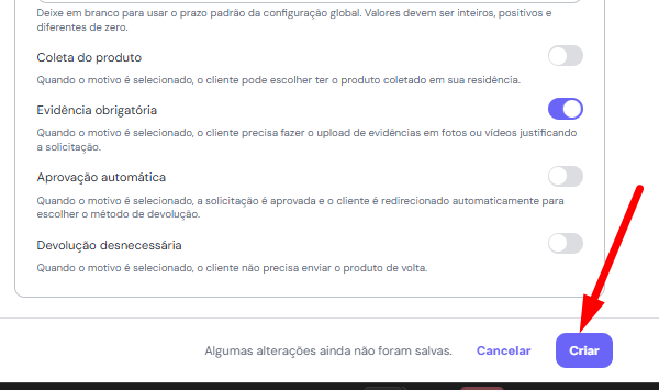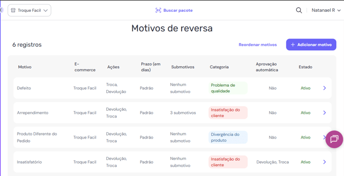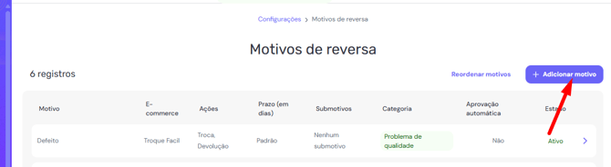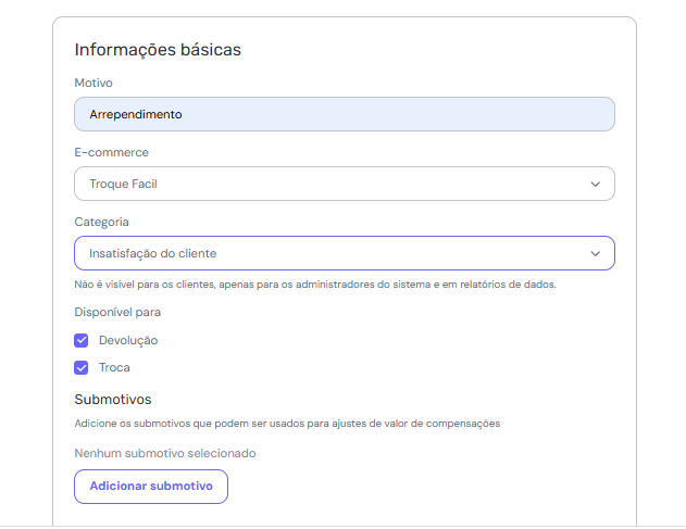 • Criar novos motivos para a operação de trocas e devoluções do seu e-commerce