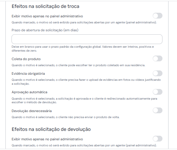Caso o motivo esteja disponível para troca e devolução, será necessário configurar as regras para ambas as ações.Configurações disponíveis: