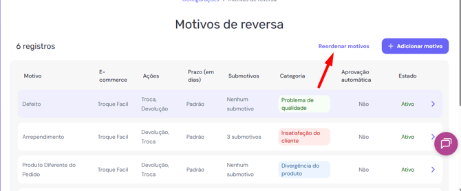 Caso deseje alterar a ordem em que os motivos aparecem para o cliente: