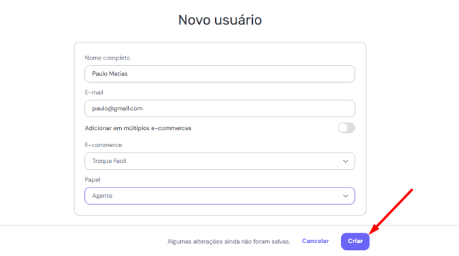 Após salvar, o usuário será cadastrado no Troque Fácil e poderá acessar a plataforma conforme o papel e permissões atribuídos.