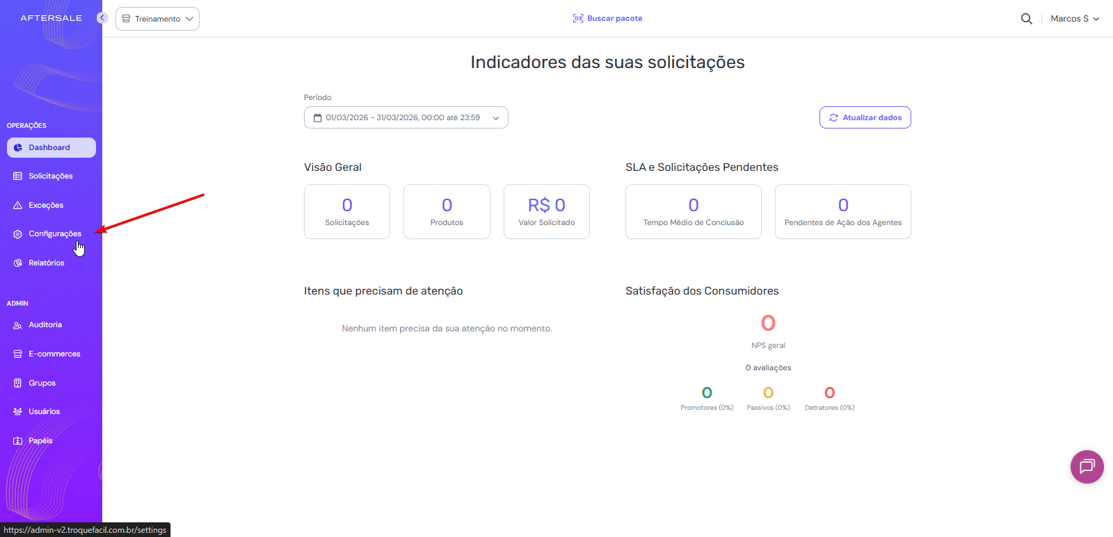 No painel lateral do sistema, acesse o menu Configurações, onde estão disponíveis as opções de parametrização das funcionalidades.