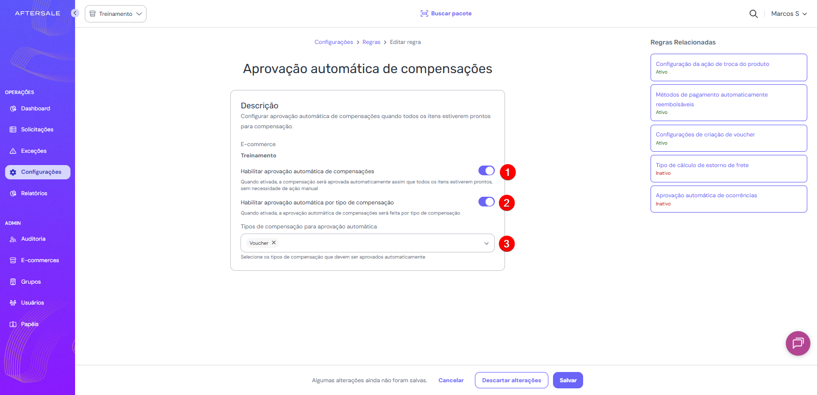 Em seguida, selecione a opção Aprovação automática de compensações (ponto 2).