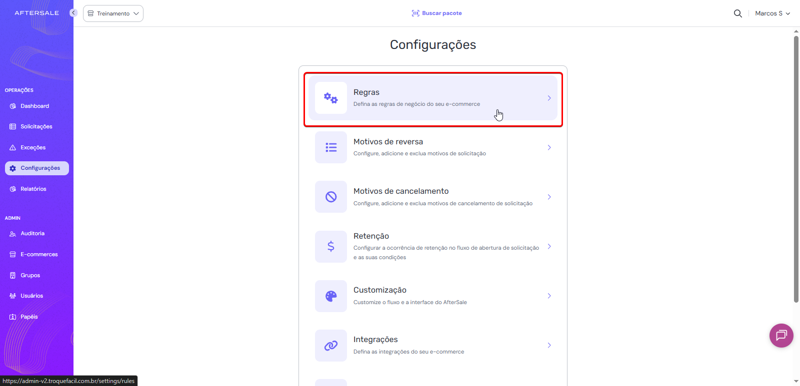 Dentro do menu de configurações, localize e clique na seção Regras, responsável pelas automações e comportamentos configuráveis do sistema.