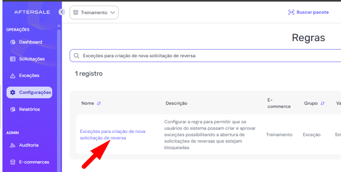 3. Localize a regra Exceções para criação de nova solicitação de reversa e clique sobre ela para abrir as configurações