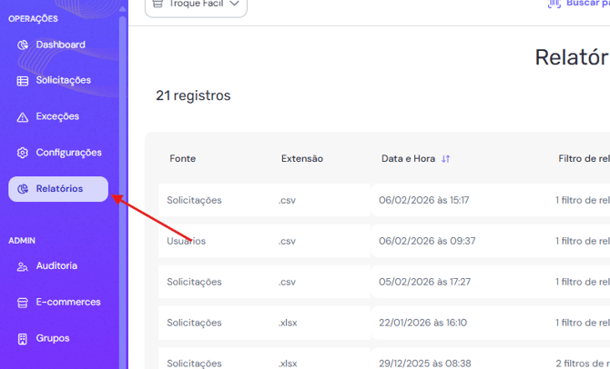 Após o processamento, o relatório ficará disponível no menu Relatórios para download.