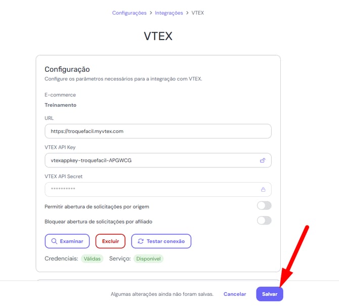 Após salvar as informações, a integração entre o Troque Fácil e a VTEX estará ativa e pronta para uso.