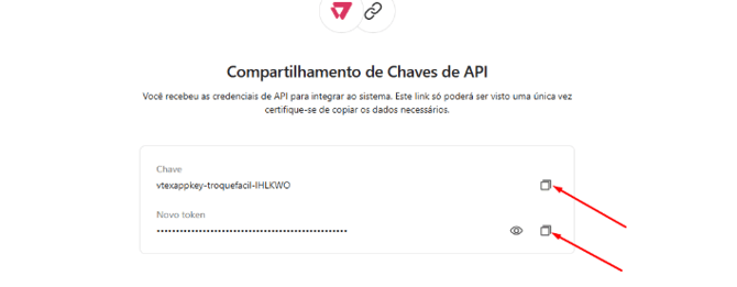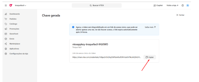 - Após a geração, a VTEX exibirá a chave (App Key).